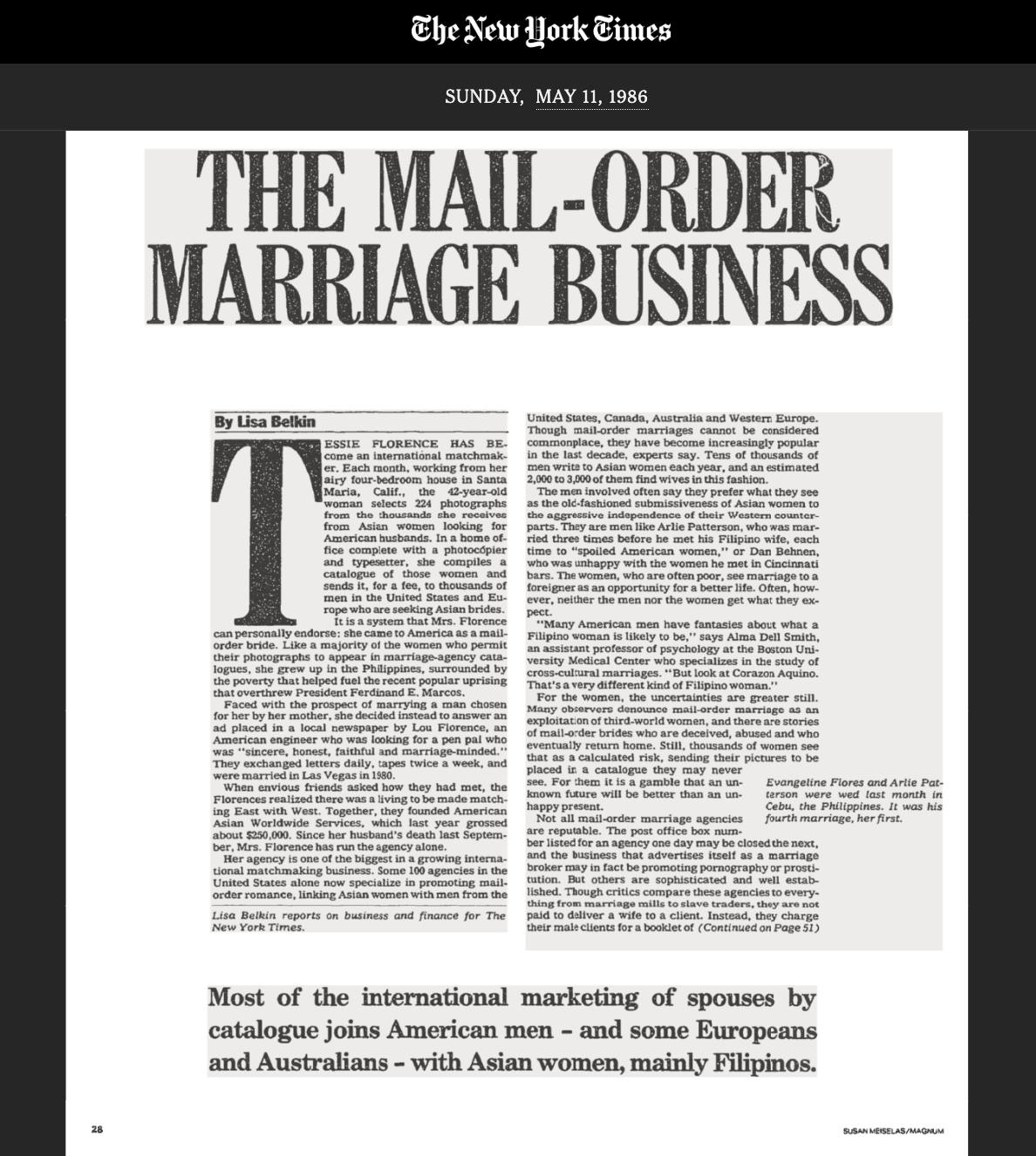 Around the late-1980s, about 50-60% of mail-order brides came from the Philippines, followed by women from Indonesia, Thailand, Malaysia, Taiwan, Singapore, Hong Kong, Korea, and Japan. Among these women, marriage to a “westerner” was considered a ticket away from poverty and political repression. Many coveted green cards, which allow them to live and work in the U.S.
